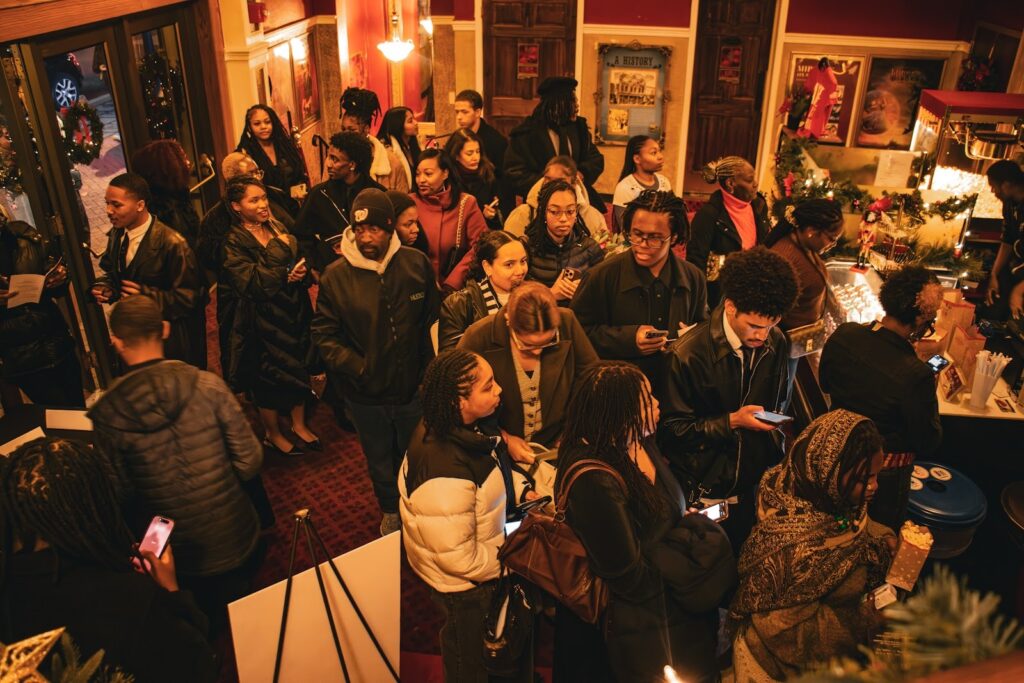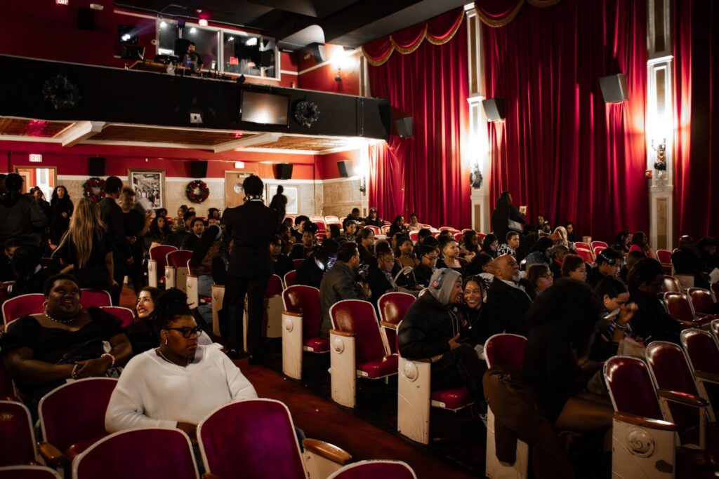 The evening began early, with students arriving in coordinated all-black attire. The smell of popcorn and the sound of laughter filled the room as attendees streamed into the red seats of the classical theater.