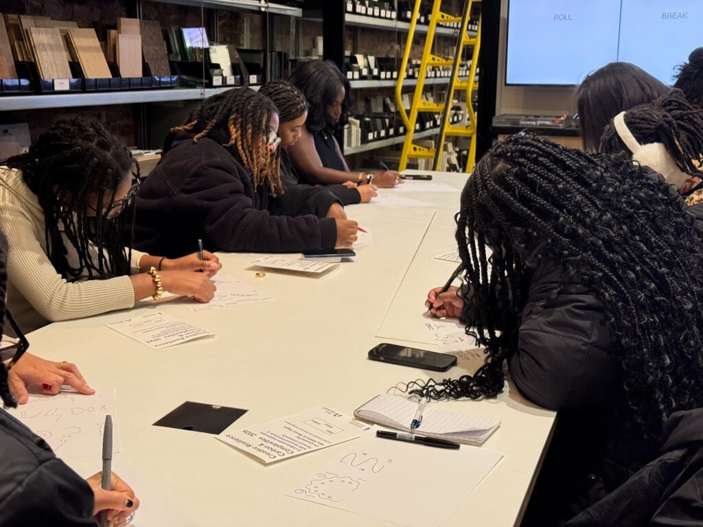 Architect Danai Metoyer gave students a tour of Leroy Street, which is home to a gallery and a studio for architecture, construction and interior design. Upstairs, in a room lined with wood samples – cypress, oak, cedar, pine and more — she led students in a sketch exercise, emphasizing that architecture is about loving the process and not the product.