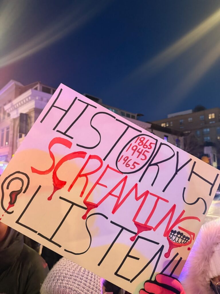“They are kidnapping people, not sharing their rights, stepping over people’s rights, invading their houses,” said Peterson, who held up a sign that read ‘History Is Screaming. Listen!’ at the walkout.